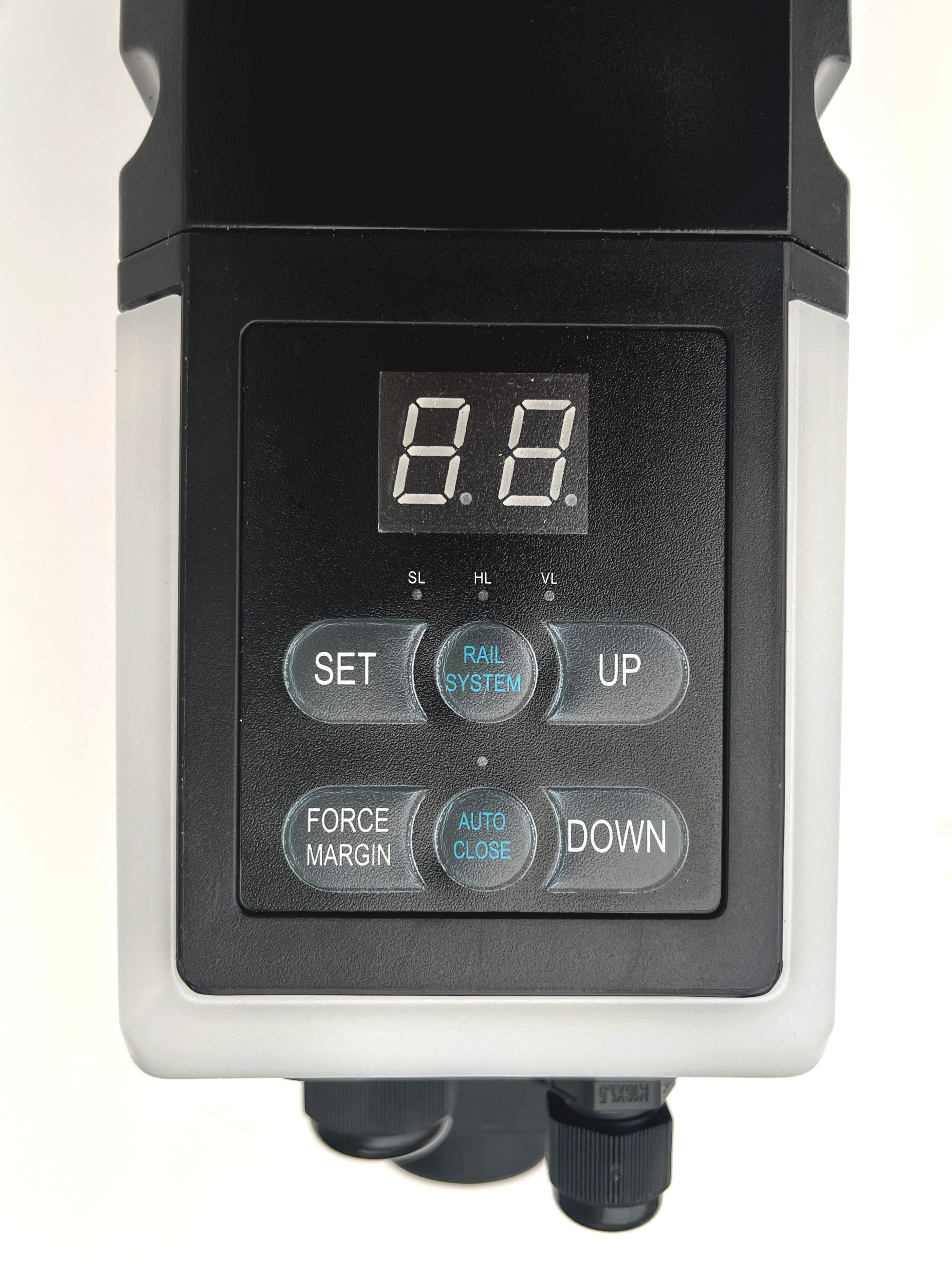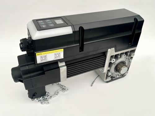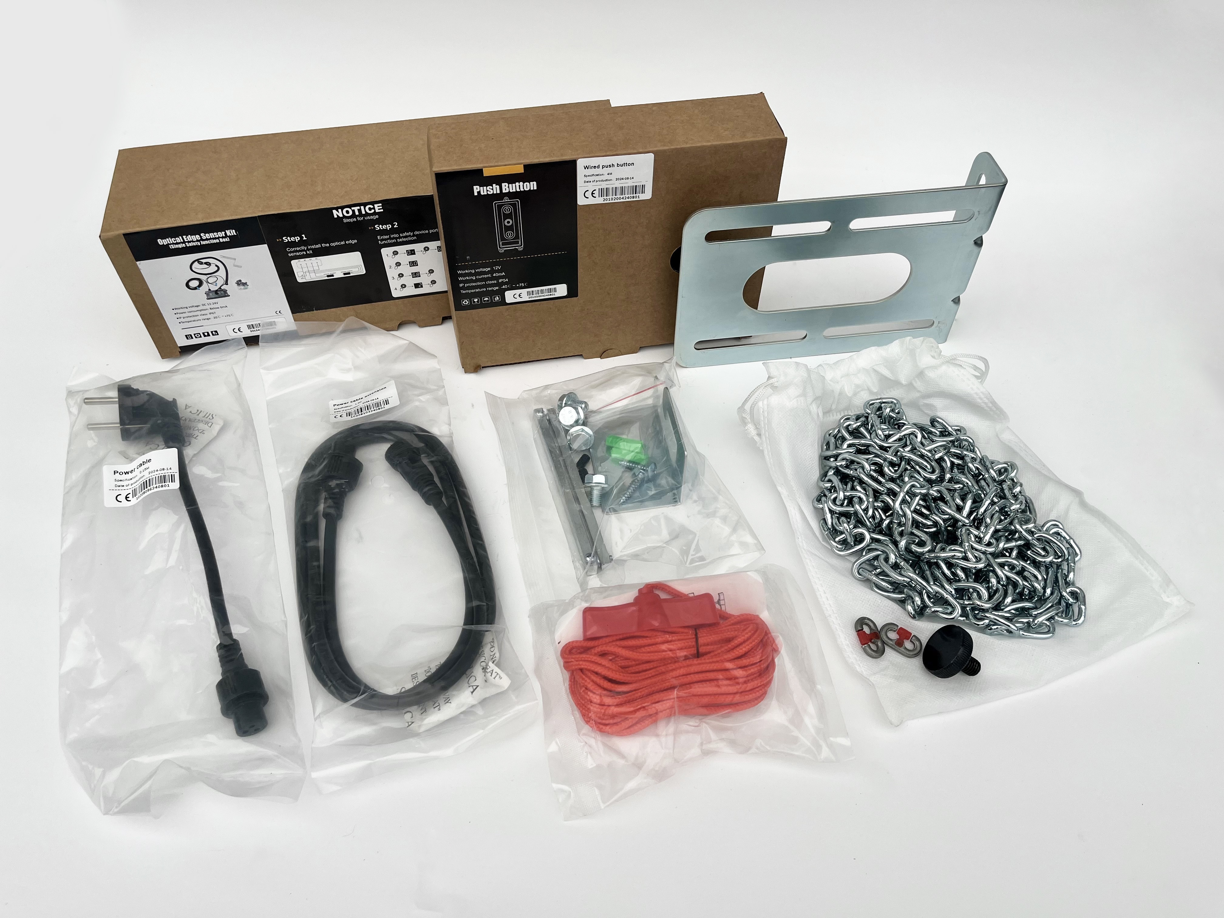 Door opener - contains 35Nm drive power head with built-in control unit, wired push button with 4m connection cable, power cable 1,3m, 220V power cable 0,15m (Standard European Plug), 4m extension emergency release cord with handle, and mounting bracket kit (light version), chain hoist with 5m manual chain, optical edge sensor kit with range TX 10m, RX 1m, and 10m spiral cable coil cord