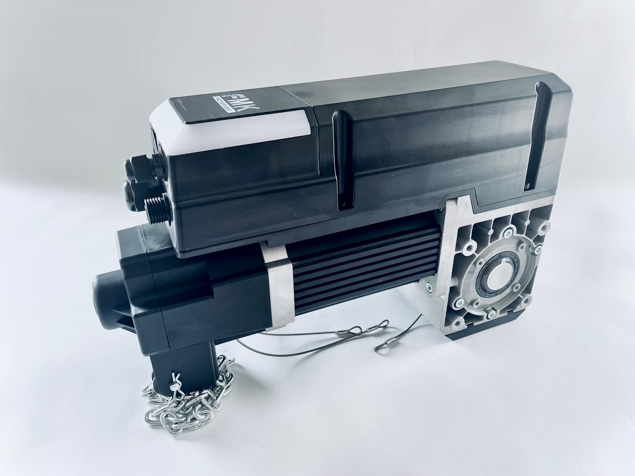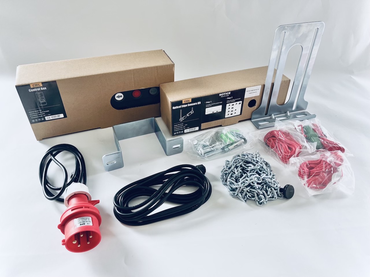 Door opener - contains 50Nm drive power head with built-in control unit, standard control box with 5m connection cable, power cable (5m) + 1x 400V CEE power red plug (three-phase), extension emergency release cord 4m with handle, chain hoist with 5m manual chain, mounting bracket kit (heavy version), optical edge sensor kit with range TX 6m cable, RX 1m cable, and 3.5m spiral cable coil cord for 5.0m high doors