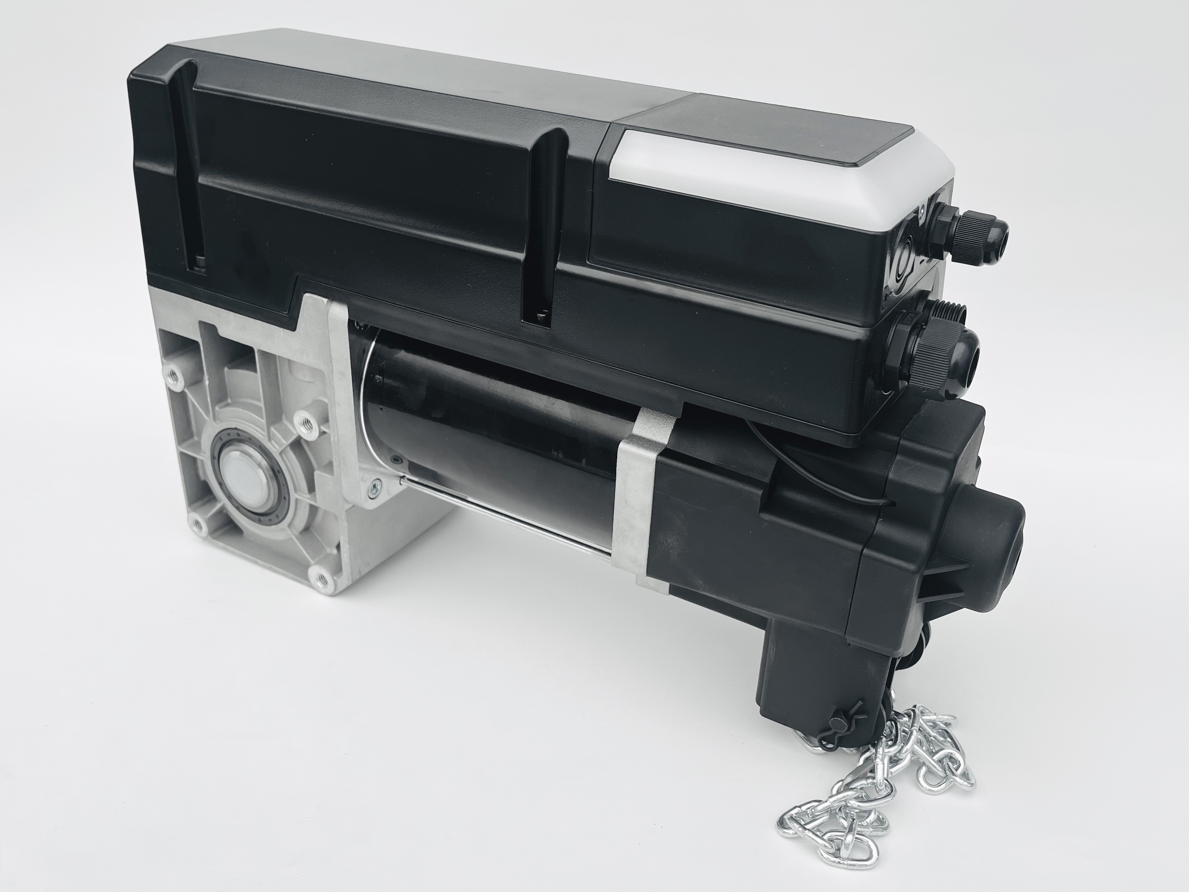 Door opener - contains 70Nm drive power head with built-in control unit, standard control box with 6m connection cable, power cable (6m) + 400V CEE power red plug (three-phase) with 15cm cable + 230V power plug (single-phase) with 15cm cable (Standard European Plug, chain hoist with 5m manual chain, mounting bracket kit (heavy version), optical edge sensor kit with range TX 10m cable, RX 1m cable, and 10m spiral cable coil cord for 8.0m high doors